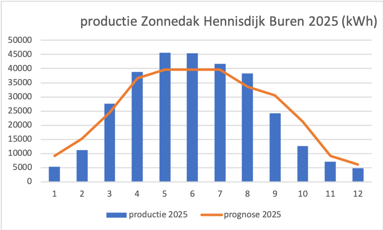 In 2025 komt de jaarproductie van onze daken op de Hennisdijk op 303088 kWh